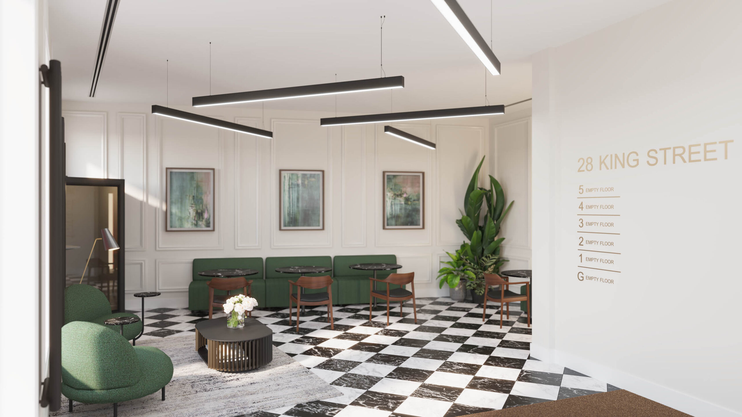 At ground level, the building is anchored by a thoughtfully designed foyer that provides a welcoming arrival experience for occupiers and visitors. The space features contemporary lounge seating, informal meeting tables, curated artwork and soft LED lighting.
